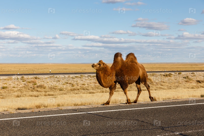 Двугорбый верблюд идет по дороге, пустыня Гоби, Внутренняя Монголия Китай