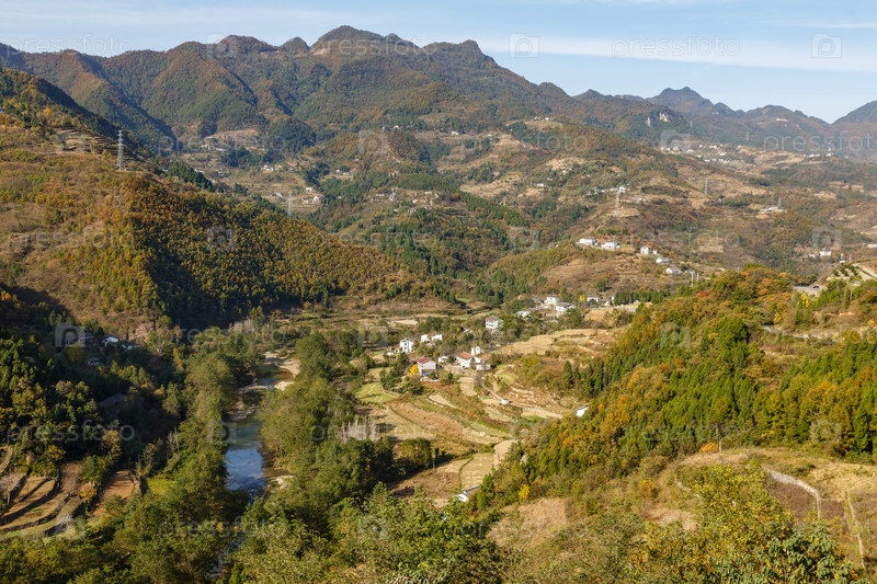 Деревенские дома в горах рядом с рекой, провинция Сычуань, Китай