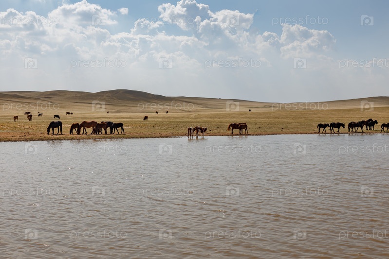 Лошади и коровы пасутся возле пруда, Внутренняя Монголия, Китай