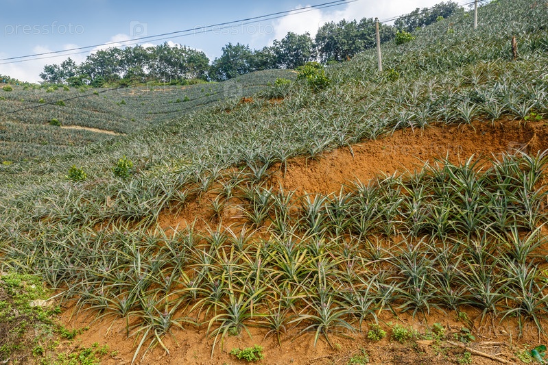 Большая плантация ананасов на склоне горы, Китай, пейзаж