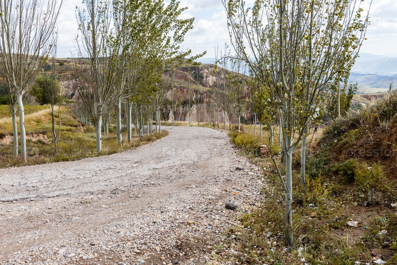 Деревня гравийная дорога в горах на деревьях вдоль дороги