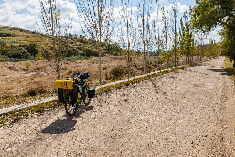 Велосипед путешественника с сумками стоит на пустой гравийной дороге