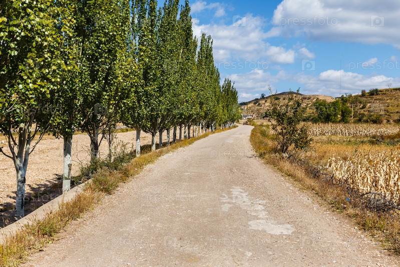 Гравийная дорога вдоль кукурузного поля с деревьями вдоль дороги