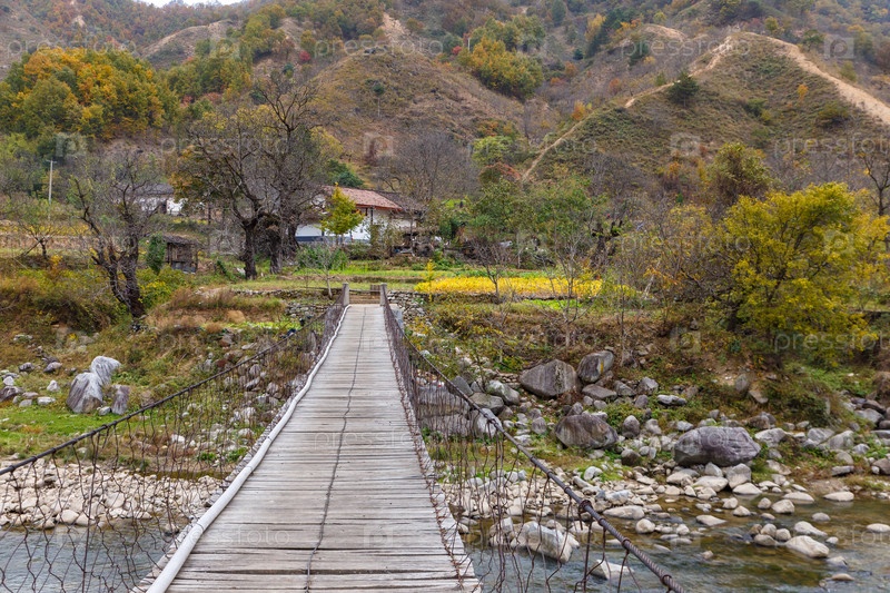 Подвесной мост через реку в горном ущелье. Деревянный мостик к дому. Провинция Шэньси. Китай