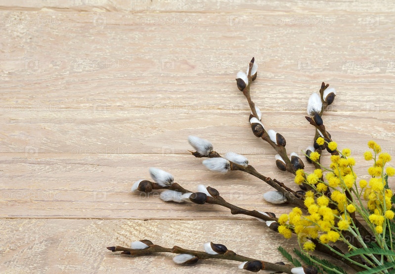 Веточки ивы на деревянном фоне. Верба и желтая мимоза крупным планом