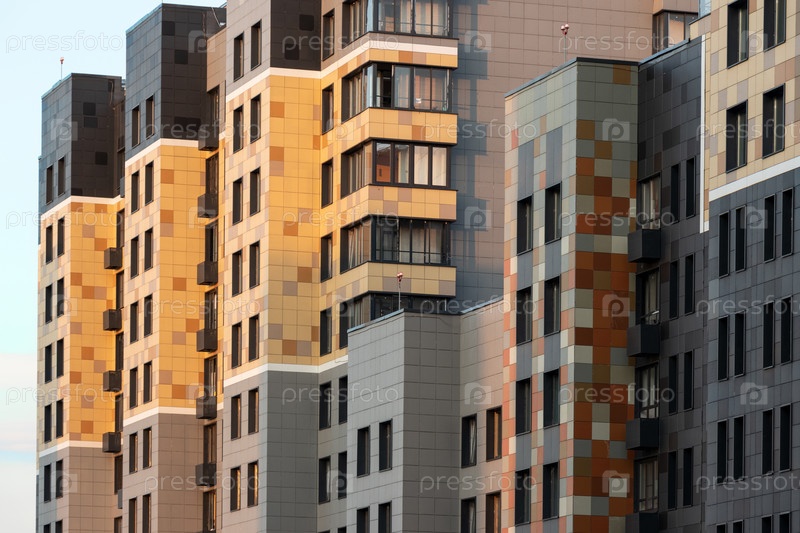 Фрагмент разноцветного фасада панельного дома с выступающими архитектурными частями на закате. Внешняя архитектура. С высоты птичьего полета
