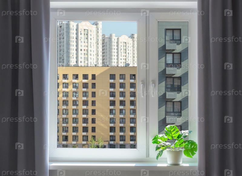 Вид через окно на фасады зданий. Плотный фон городской застройки. Внутреннее пространство с темно-серыми шторами и комнатным растением