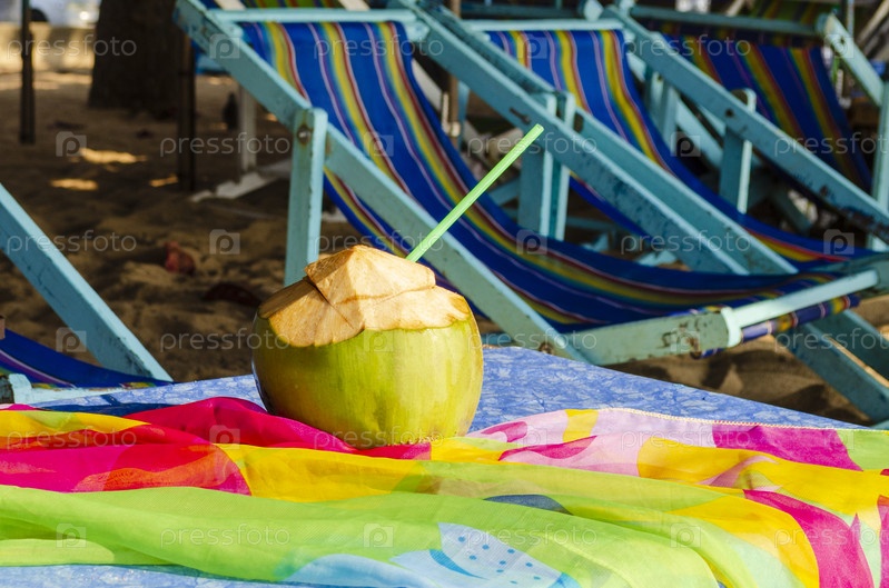 Готовый к употреблению кокосовый свежий зеленый кокос с шезлонгами
