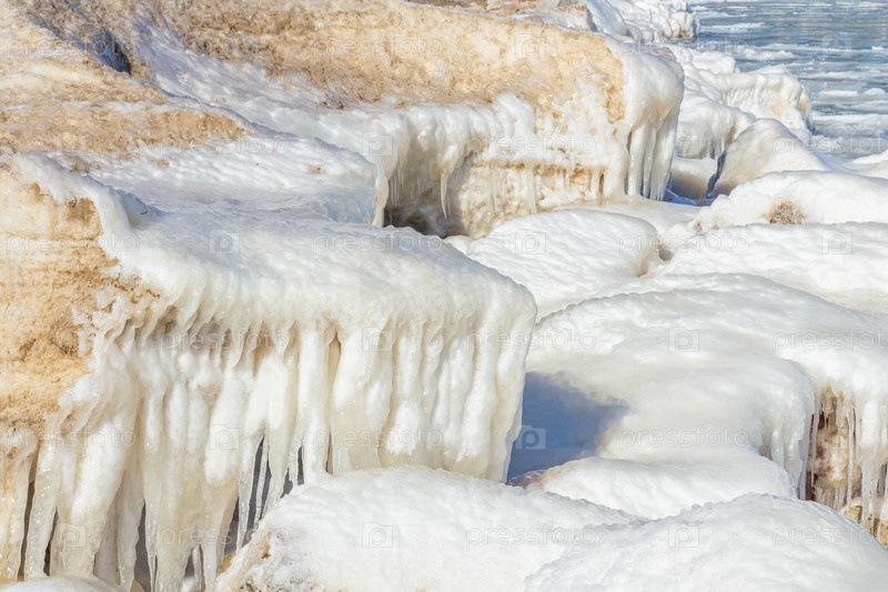 Крупный план ледяного берега, замерзших волн, скал и солнечных бликов на льду