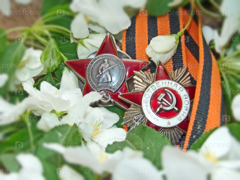 Ордена «Отечественной войны» и "Красной Звезды" на фоне георгиевской ленты и цветов яблони. Награды фронтовика. Семейная реликвия. Память. 9 мая День Победы