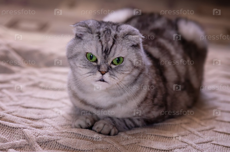 Серый шотландский вислоухий кот лежит на теплом бежевом пледе. Уютная милая теплая концепция дома с домашним животным