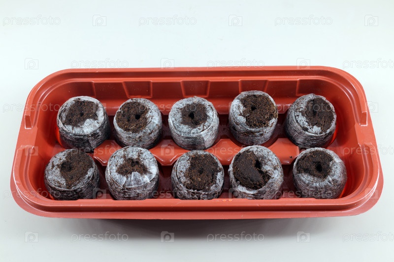 Торфяные таблетки для мелких семян, замоченные в воде, находятся в пластиковом контейнере