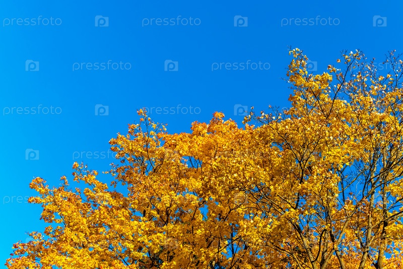 Кленовые ветки с желтыми листьями на фоне голубого неба