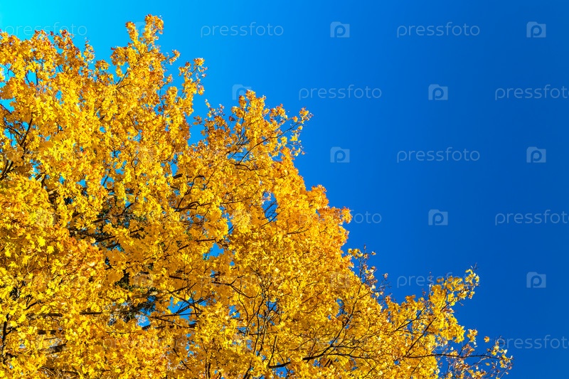 Кленовые ветки с сухими желтыми листьями на фоне голубого неба