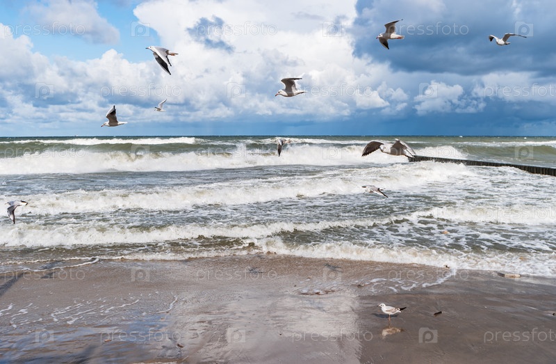 Вид на песчаный берег Балтийского моря с летающими чайками Бонапарта