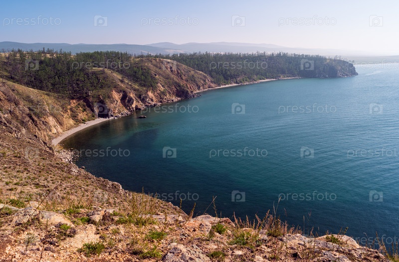 Вид на пейзажи острова Ольхон с мыса Нюрганский. Береговая линия со скалами и лесом