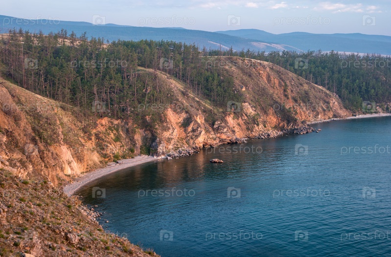 Пейзажи острова Ольхон с мыса Нюрганский. Береговая линия со скалами и лесом. Сибирь, Россия