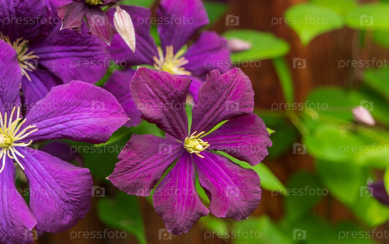 Яркие фиолетовые бутоны крупноцветкового клематиса Jackmanii (Jackman) на фоне деревянной стены
