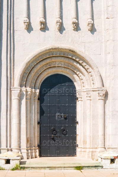 Вид на украшенный дверной портал церкви Покрова на Нерли. Храм во Владимирской области России, построенный в 12 веке