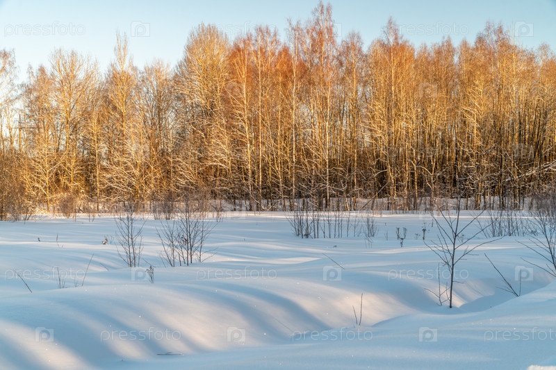 Зимний пейзаж со снегом и деревьями в солнечный день. Природный ландшафт зимой. Заснеженное поле