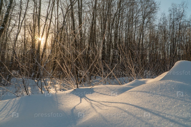 Зимний пейзаж со снегом и деревьями в солнечный день. Природный ландшафт зимой. Заснеженное поле