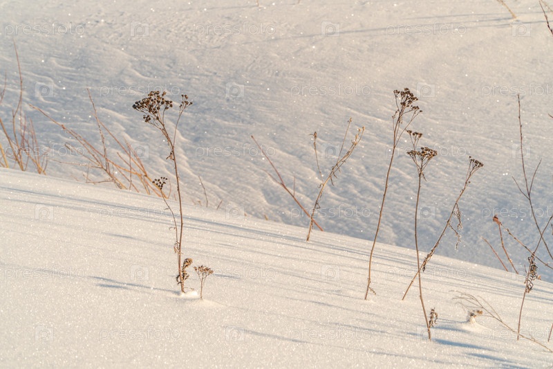 Зимний пейзаж со снегом и деревьями в солнечный день. Природный ландшафт зимой. Заснеженное поле