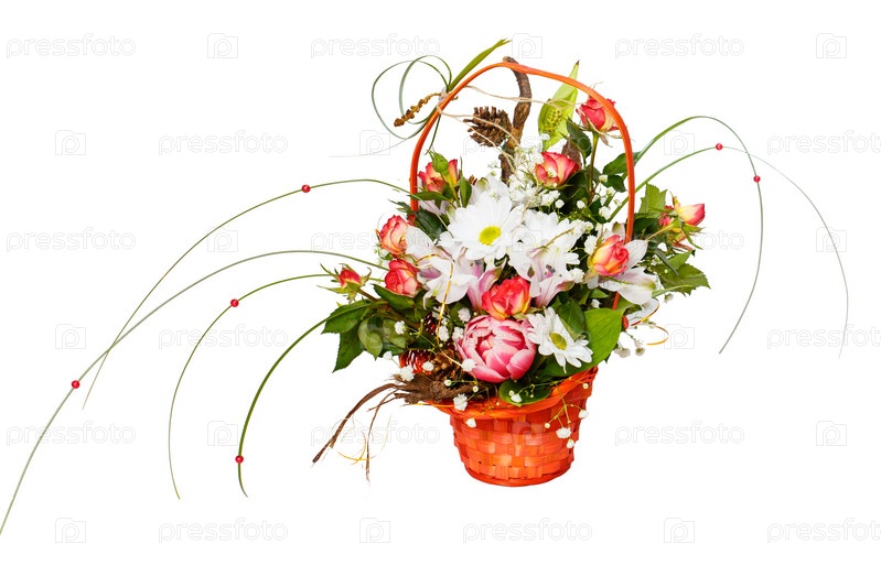 Букет белых ромашек и красных роз в плетеной корзине на белом фоне. Цветы, букет в стильной корзине