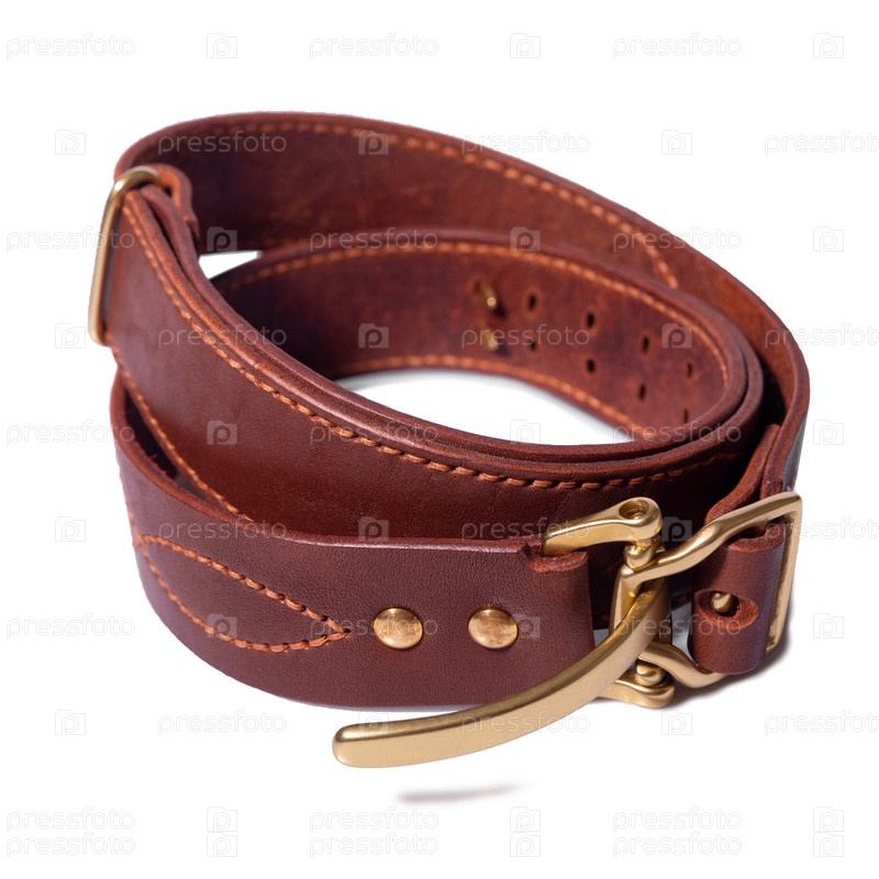 Изолирован свернутый коричневый кожаный ремень с металлической пряжкой на белом фоне. Место для рекламы, логотипа, этикетки, макета, макета