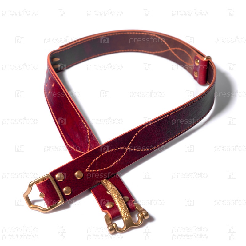 Изолирован свернутый коричневый кожаный ремень с металлической пряжкой на белом фоне. Место для рекламы, логотипа, этикетки, макета, макета