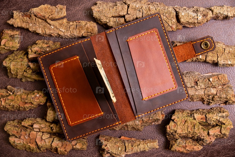 Открытый коричневый мужской кошелек с деньгами и кредитными картами