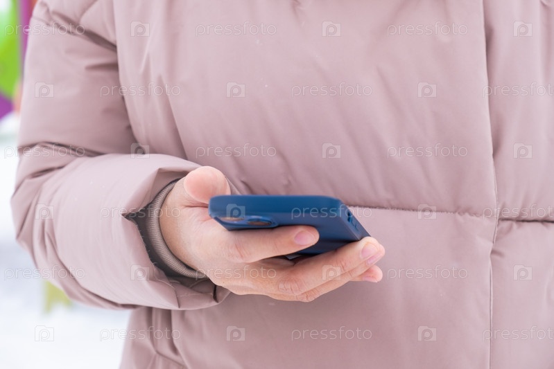 Девушка в бежевом пальто с голубым телефоном в руках. Зима. Фото высокого качества