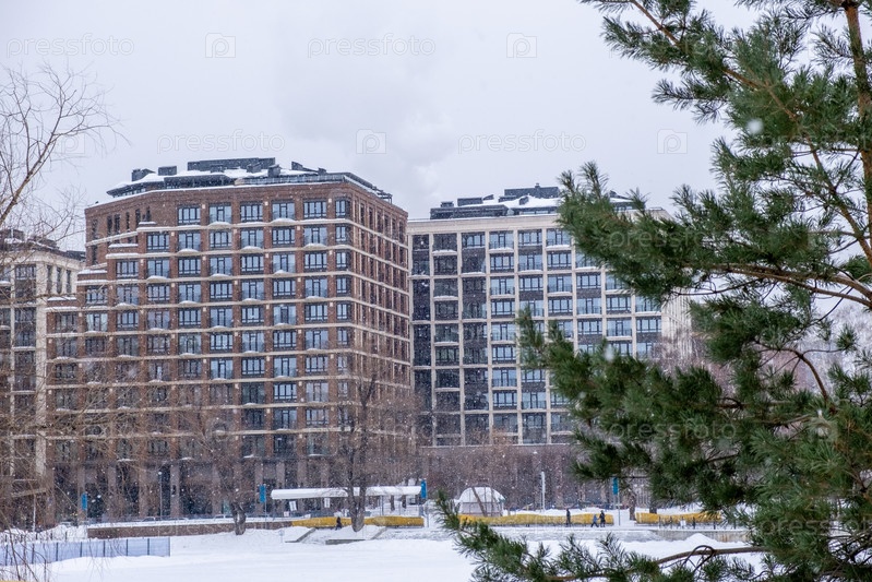 Многоэтажные жилые дома за парком. Фото высокого качества