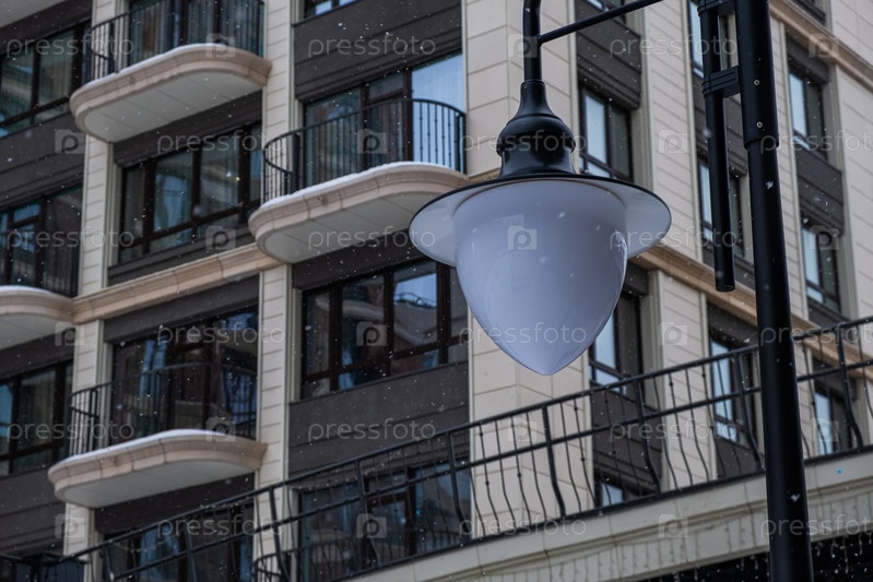 Фонарь на фоне жилого дома. Идет снег. Фото высокого качества