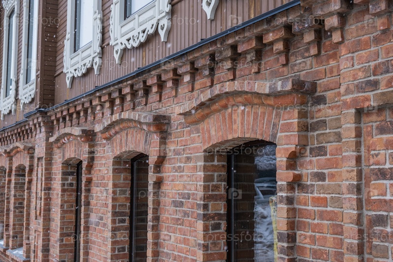 Резные оконные рамы исторического здания после реконструкции. Фото высокого качества