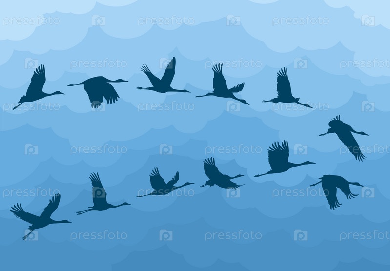 Полет птиц с голубыми облаками