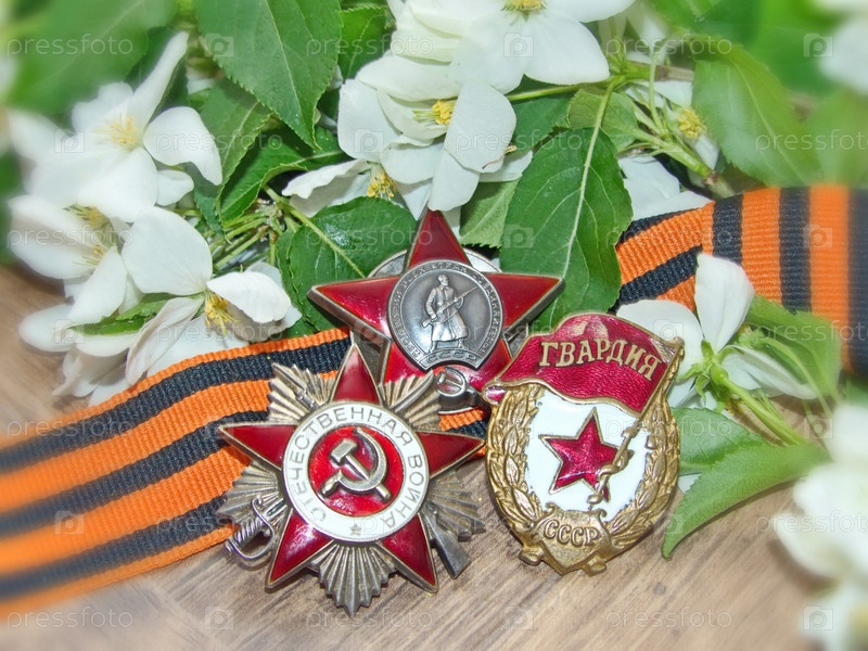 Ордена «Отечественной войны» и "Красной Звезды", знак «Гвардия» на на фоне георгиевской ленты и цветов яблони. Награды фронтовика. Семейная реликвия. Память. 9 мая День Победы