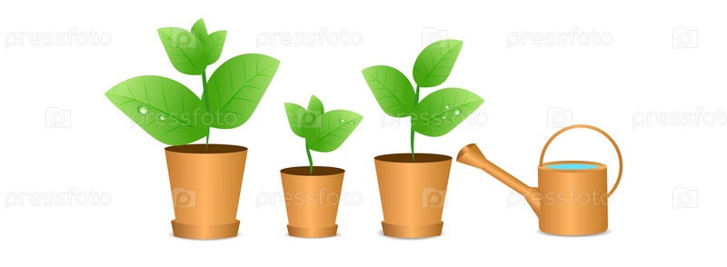 Широкий баннер на белом фоне, зеленые растения в горшках, весенние саженцы, лейка. озеленение и полив