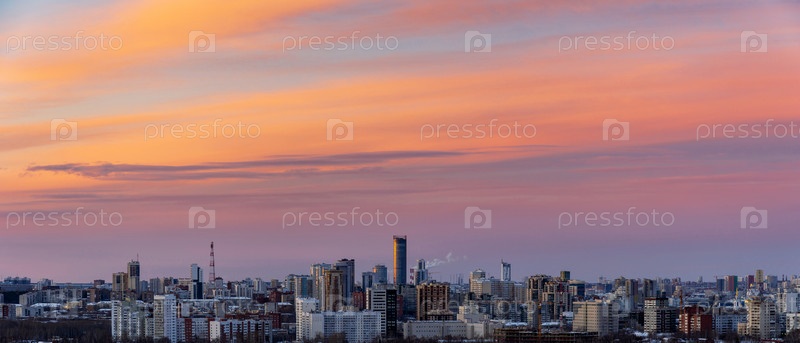 Рассветные облака над мегаполисом раннего зимнего заката в Екатеринбурге