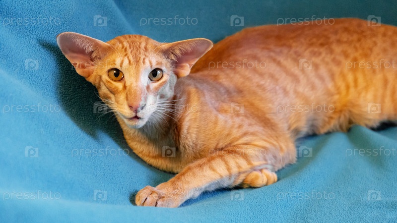 Рыжий кот породы Ориентал на зеленом фоне сиденья