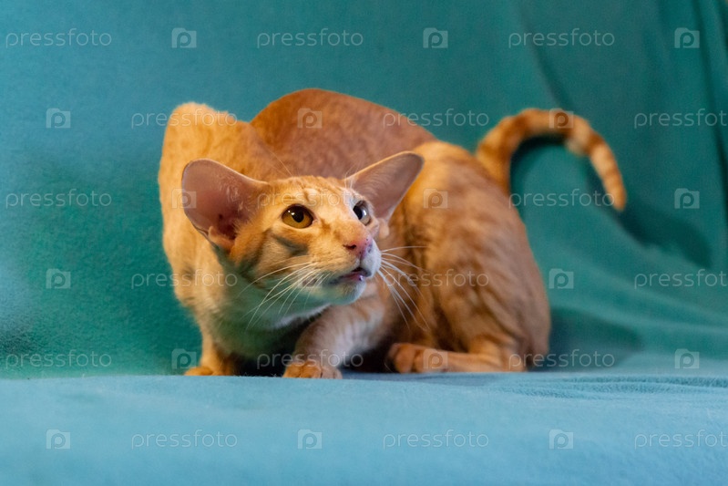 Красная кошка породы восточная на зеленом фоне