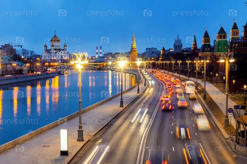 Вид на Кремлевскую набережную с Москворецкого моста на Храм Христа Спасителя и водонапорную башню
