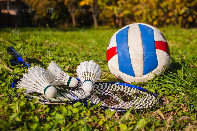Ракетки для бадминтона, воланы и волейбольный мяч лежат в парке на траве