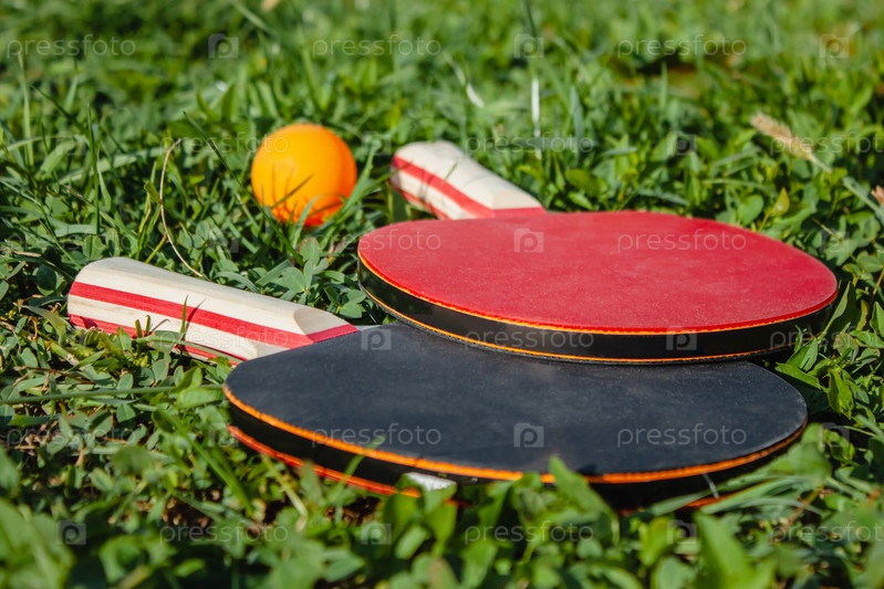 Две ракетки для настольного тенниса и оранжевый мяч лежат на траве