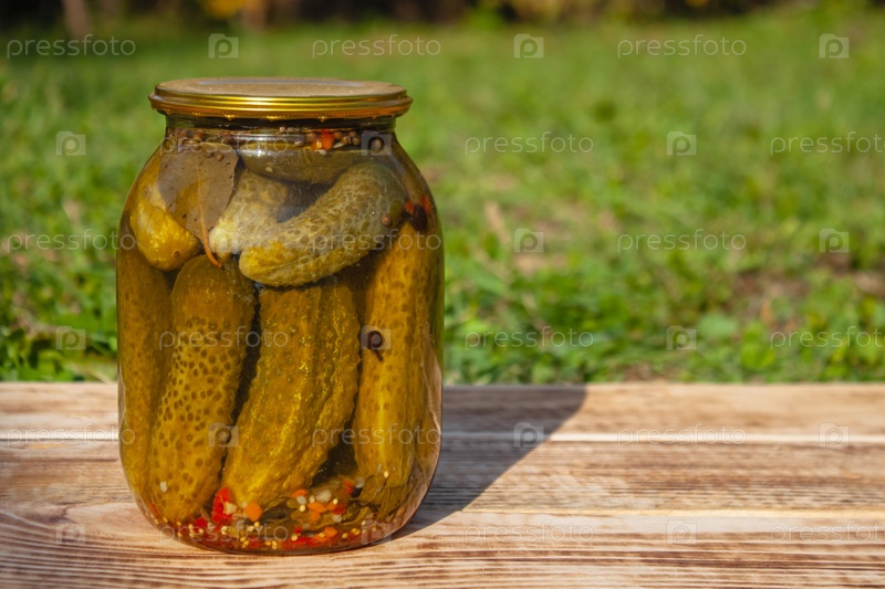 Банка консервированных огурцов стоит на доске на фоне зеленой травы