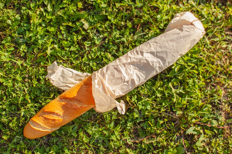 Багет в бумажной упаковке лежит на траве