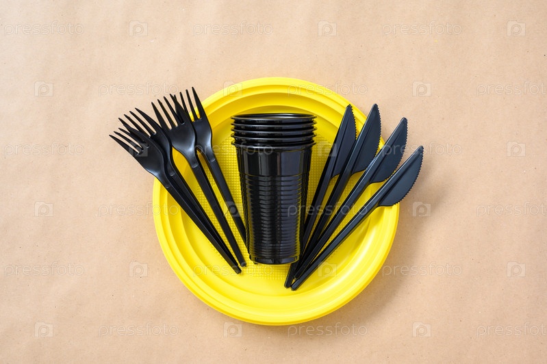 Набор пластиковой одноразовой посуды для пикника на бумажном фоне. Вид сверху