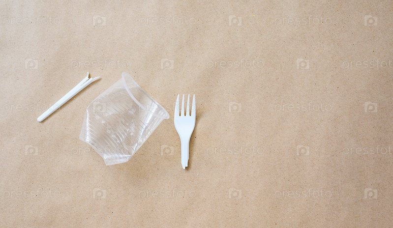 Пластиковый мусор на бумажном фоне. Плоская планировка, пространство для копирования