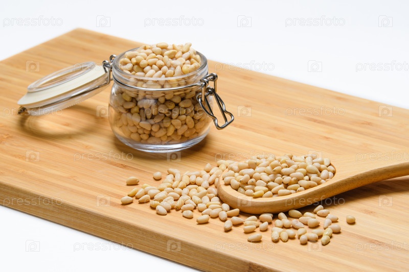 Кедровые орехи на деревянной доске. Деревянная ложка с кедровыми орехами на фоне банки с орехами. Селективный фон на ложке с орехами