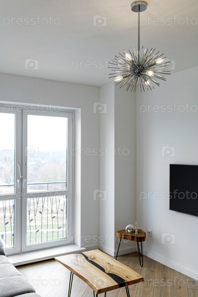 Гостиная с серым диваном, круглым журнальным столиком и огромным окном
