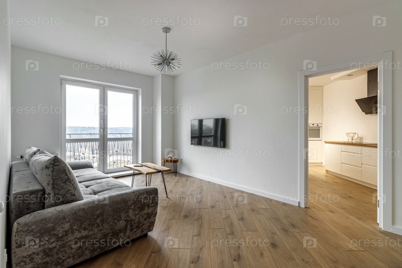 Гостиная с серым диваном, круглым журнальным столиком и огромным окном
